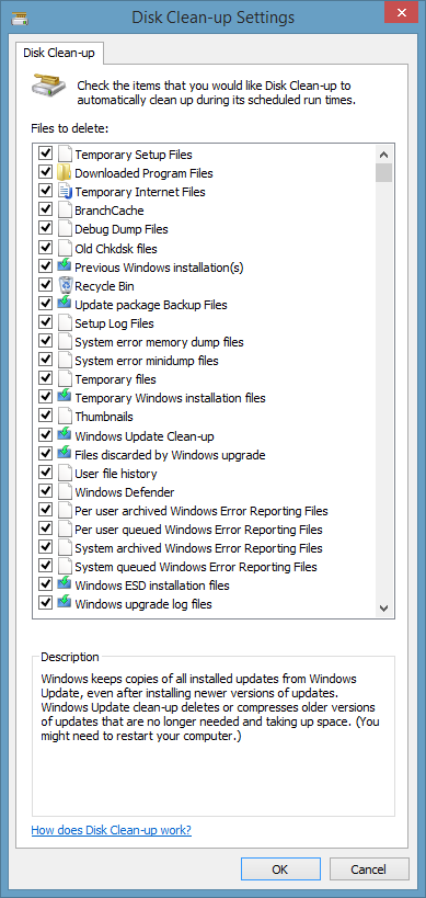 디스크 정리 (Disk Clean-up)는 많은 흥미로운 항목을 제거 할 수 있습니다. 대부분의 항목은 실제로 PC와 영구적 인 데스크톱 배포 후 적용될 것입니다. 다음은 Windows 8.1에서 디스크 정리가 관리 할 수있는 항목입니다.